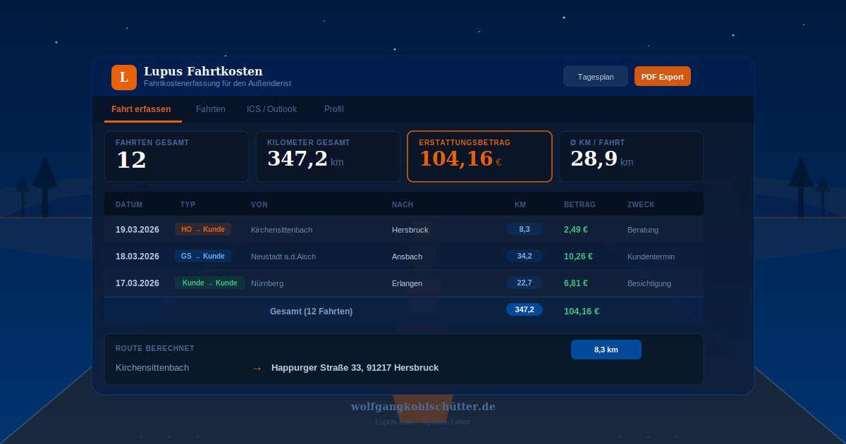 Lupus Fahrtkosten ist für alle die regelmäßig Kilometer abrechnen — Außendienstler, Berater, Handwerker, Freiberufler. Besonders praktisch ist es wenn das eigene Firmen-IT-System keine eigene Software erlaubt: das Tool läuft komplett im Browser, braucht keine Installation und hinterlässt keine Spuren auf dem Firmensystem.