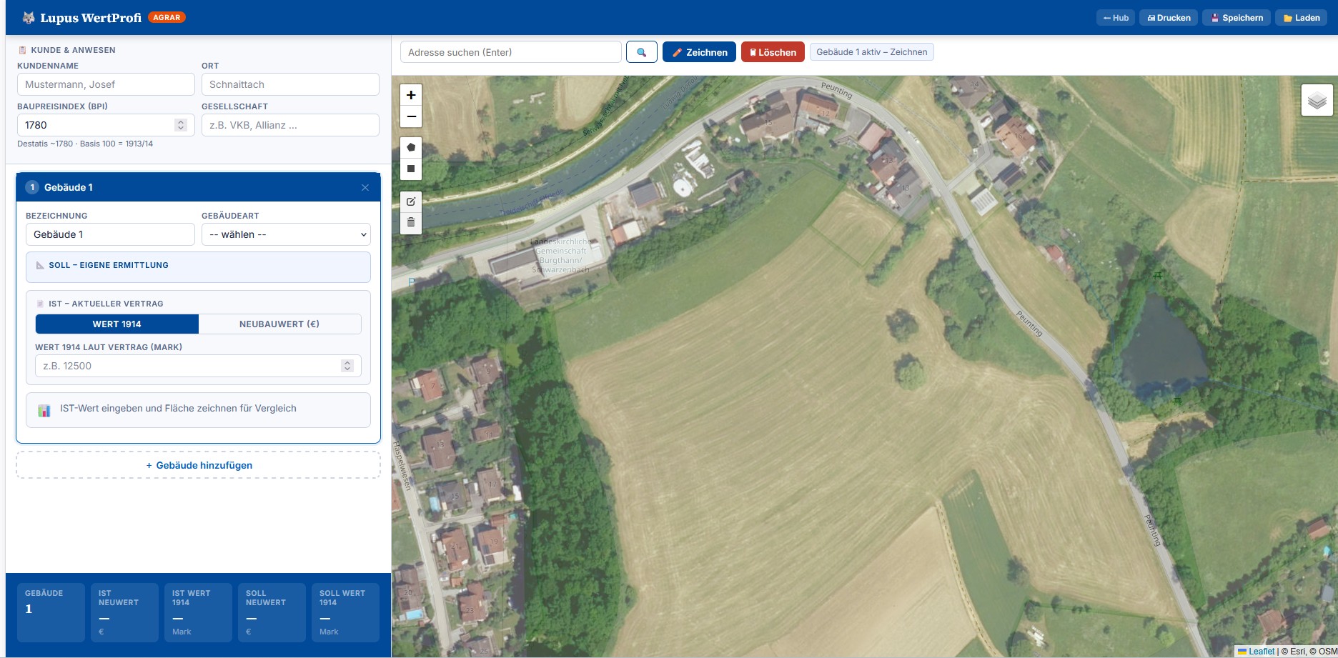 - Gebäude einzeichnen → Grundfläche wird exakt gemessen